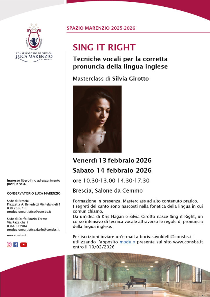 13 e 14 febbraio 2025 – Spazio Marenzio – SING IT RIGHT Tecniche vocali per la corretta pronuncia della lingua inglese Masterclass di Silvia Girotto